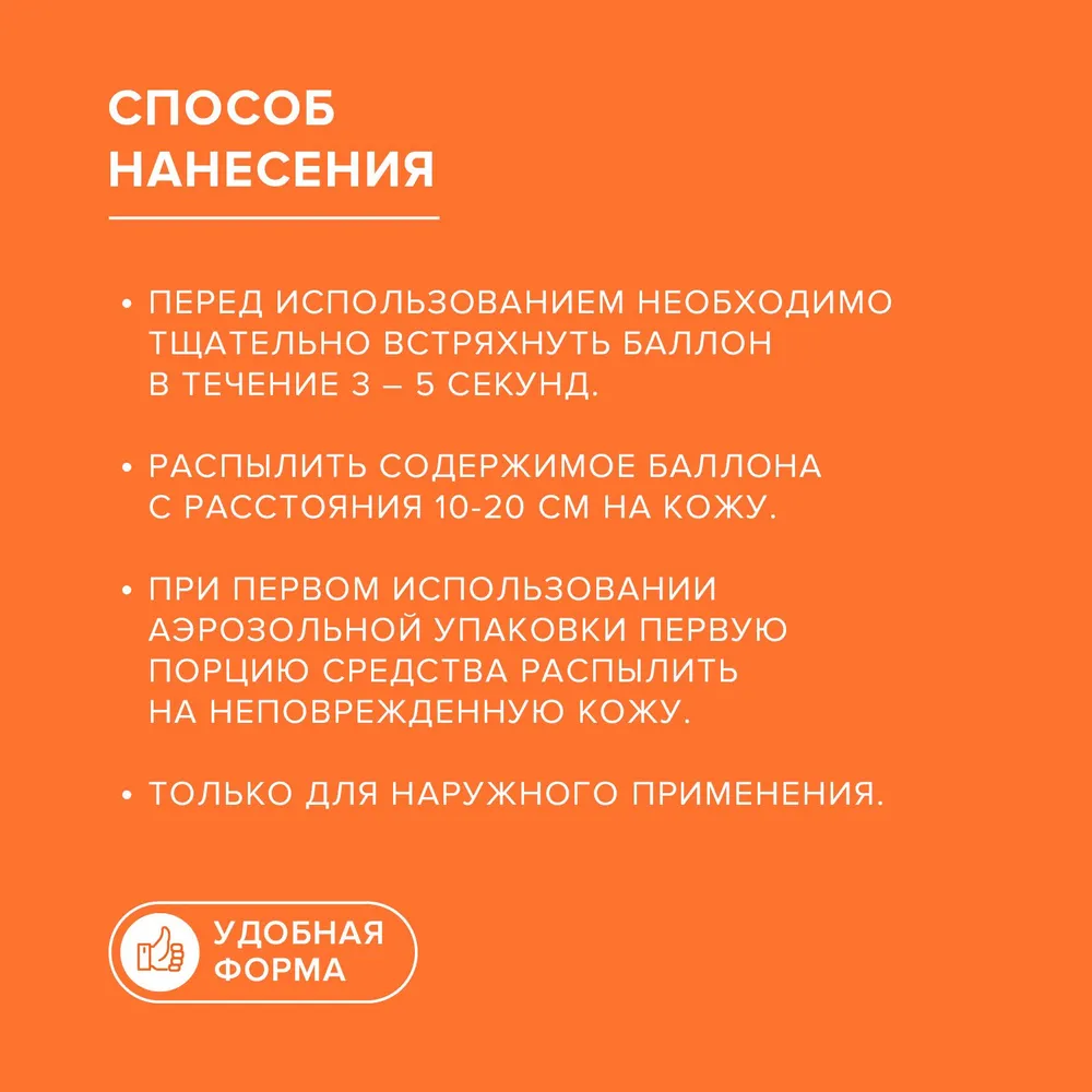 - Перед использованием необходимо тщательно встряхнуть баллон в течение 3 –5 с. Распылить содержимое баллона с расстояния 10-20 см на кожу. При первом использовании аэрозольной упаковки первую порцию средства распылить на неповрежденную кожу. Только для наружного применения.