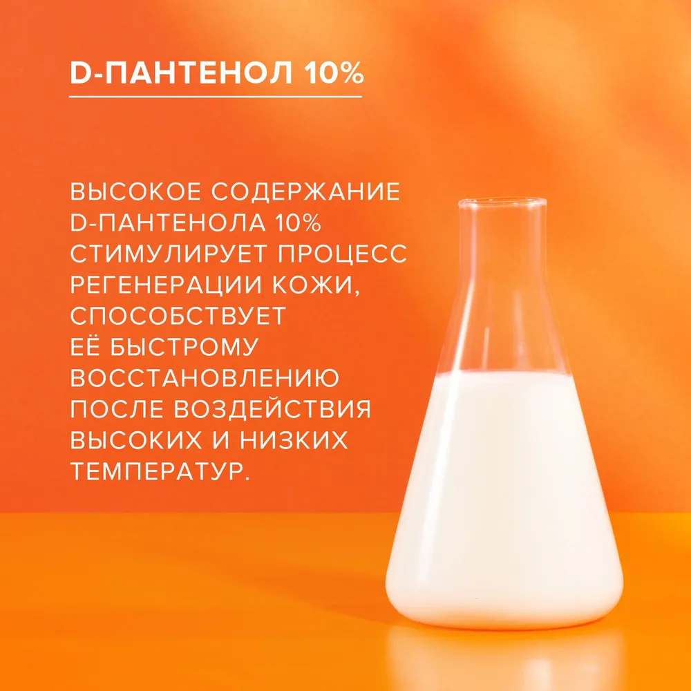 Высокое содержание D-пантенола 10% стимулирует процесс регенерации кожи, способствует её быстрому восстановлению после воздействия высоких и низких температур.
